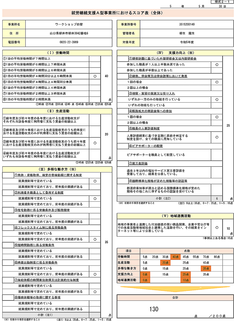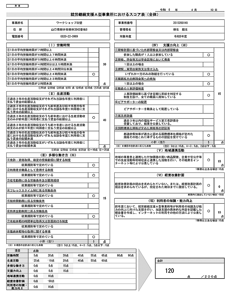 | 就労継続支援A型事業所におけるスコア表 ( 384 KB / 2024/05/31 11:37 ) |