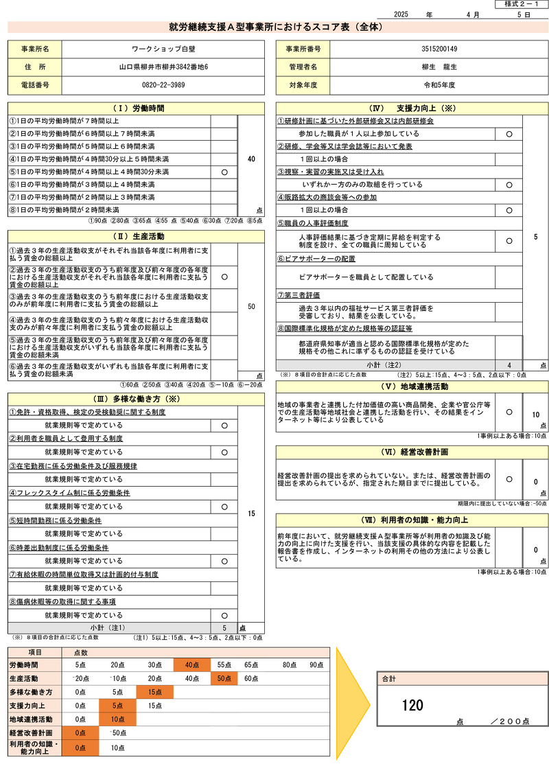 | 就労継続支援A型事業所におけるスコア表 ( 450 KB / 2025/07/02 13:04 ) |